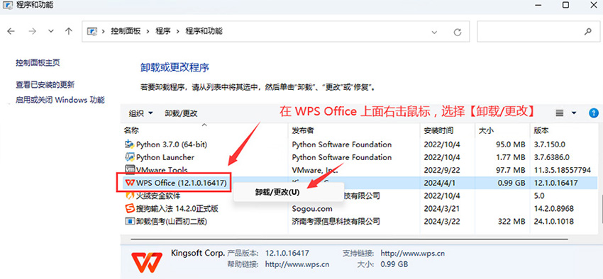 2、在程序列表中找到【W(wǎng)PS Office】,在 WPS Office 上面右擊鼠標,選擇【卸載/更改】。