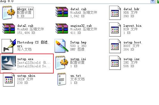 5、打開photoshop 8.0文件夾,雙擊文件“setup.exe”。