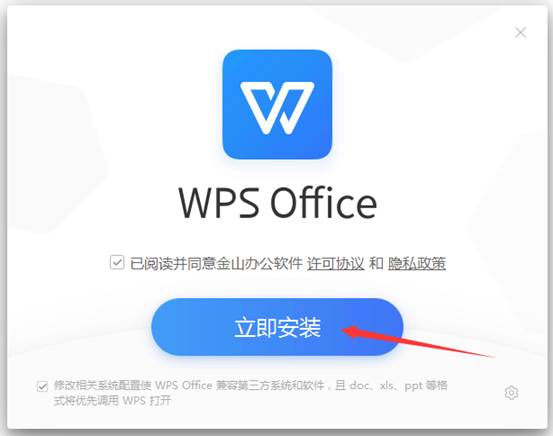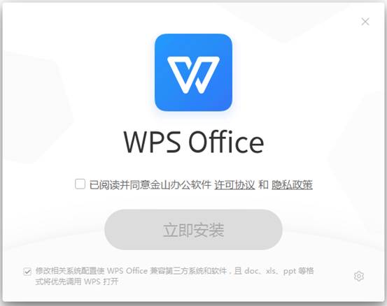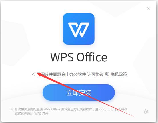 3、勾選已閱讀并同意金山辦公軟件許可協(xié)議和隱私策略。
